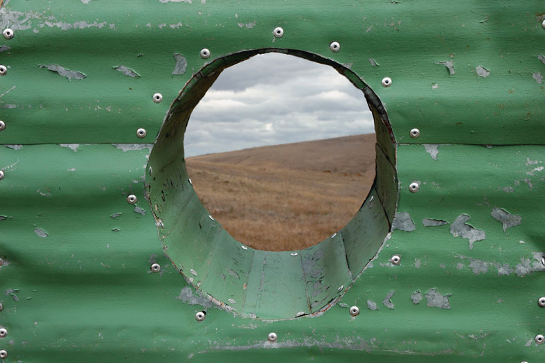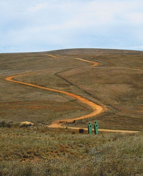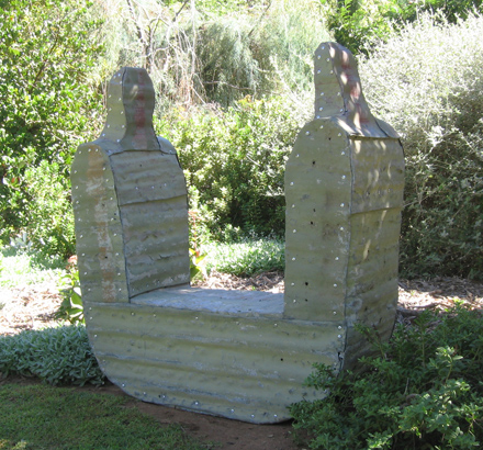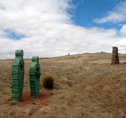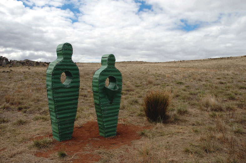 The two abstracted figures are covered with layers of weathered corrugated iron. The use of iconographic roof material in this land of extremes suggests the dichotomy of protection and vulnerability. The landscape transends and passes through the individual yet mirrors the interconnectedness of all life.